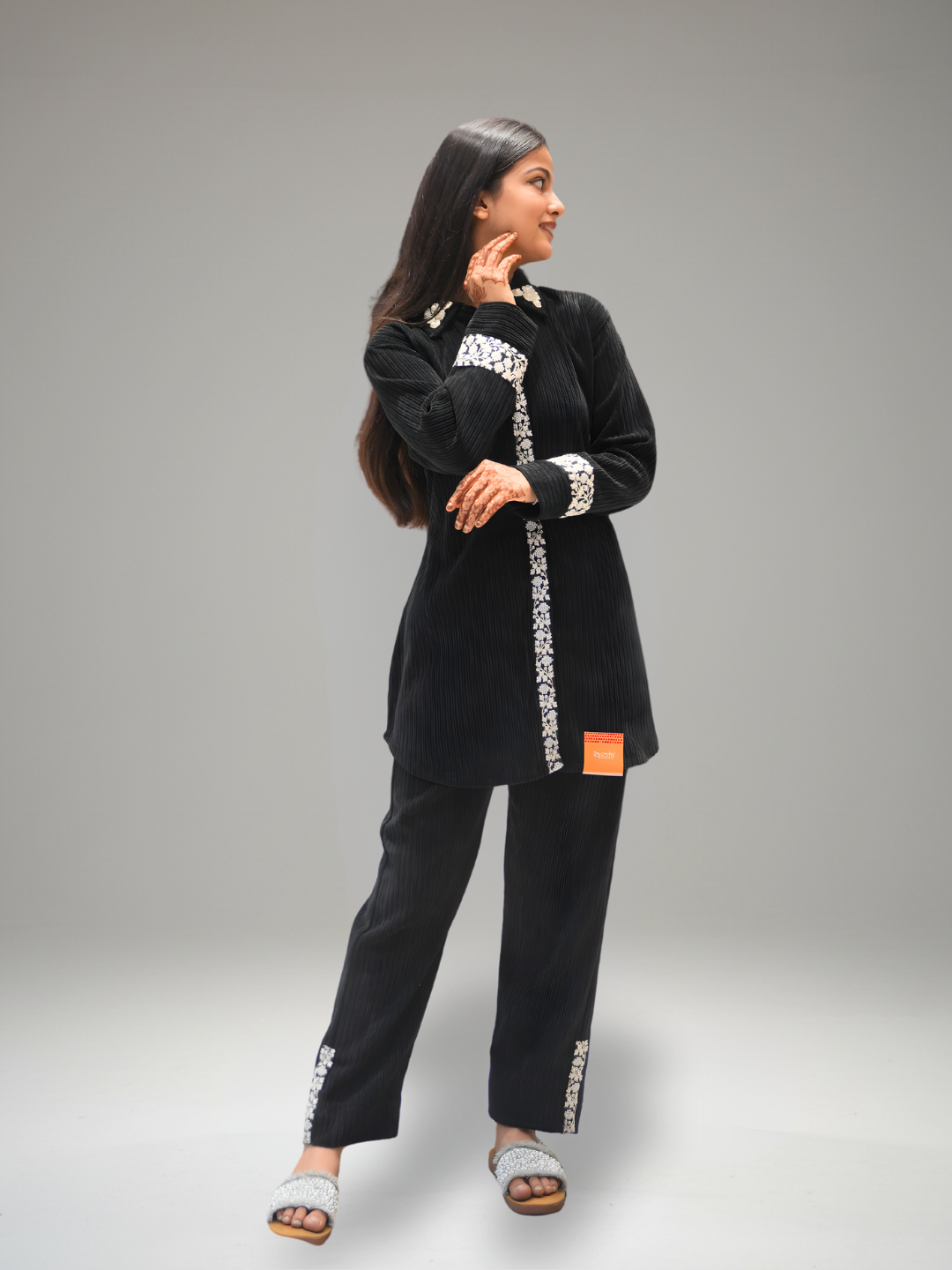 Turn heads effortlessly with our Black Lycra Velvet Co-ord Set.