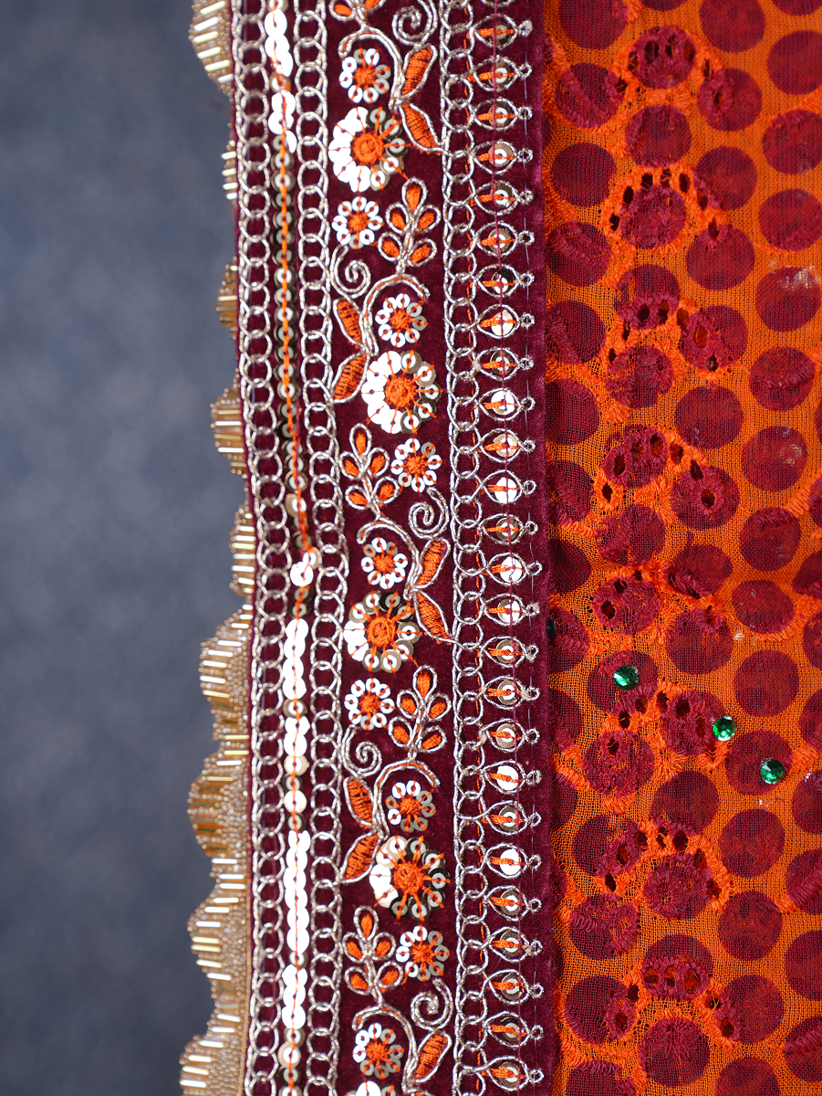Graceful georgette chicken picchoda enhanced with rich maroon lace and matching jhalar lace, offering a perfect blend of tradition, elegance, and contemporary style.