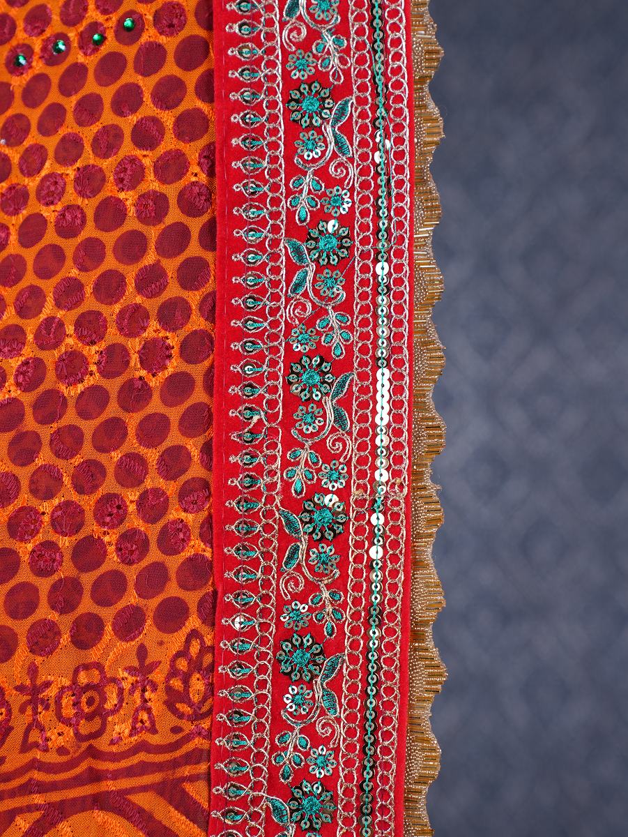 Beautiful georgette chicken picchoda accented with vibrant red lace and matching jhalar lace, creating a striking fusion of cultural elegance and refined craftsmanship.