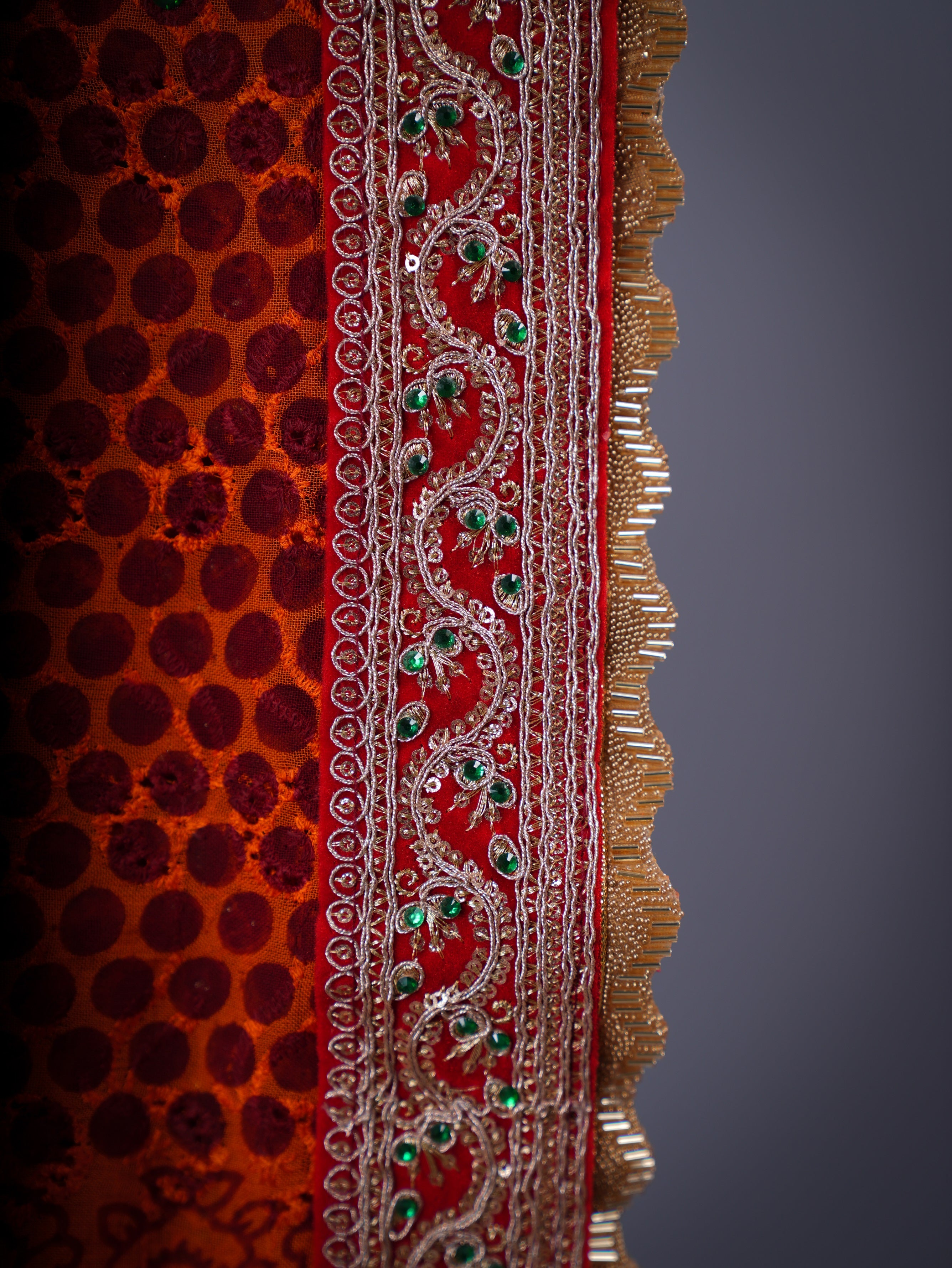 Elegant georgette ensemble featuring a stylish chicken picchoda design, enhanced with striking red lace and delicate handwork detailing. A perfect blend of tradition and modern charm, ideal for festive and special occasions.