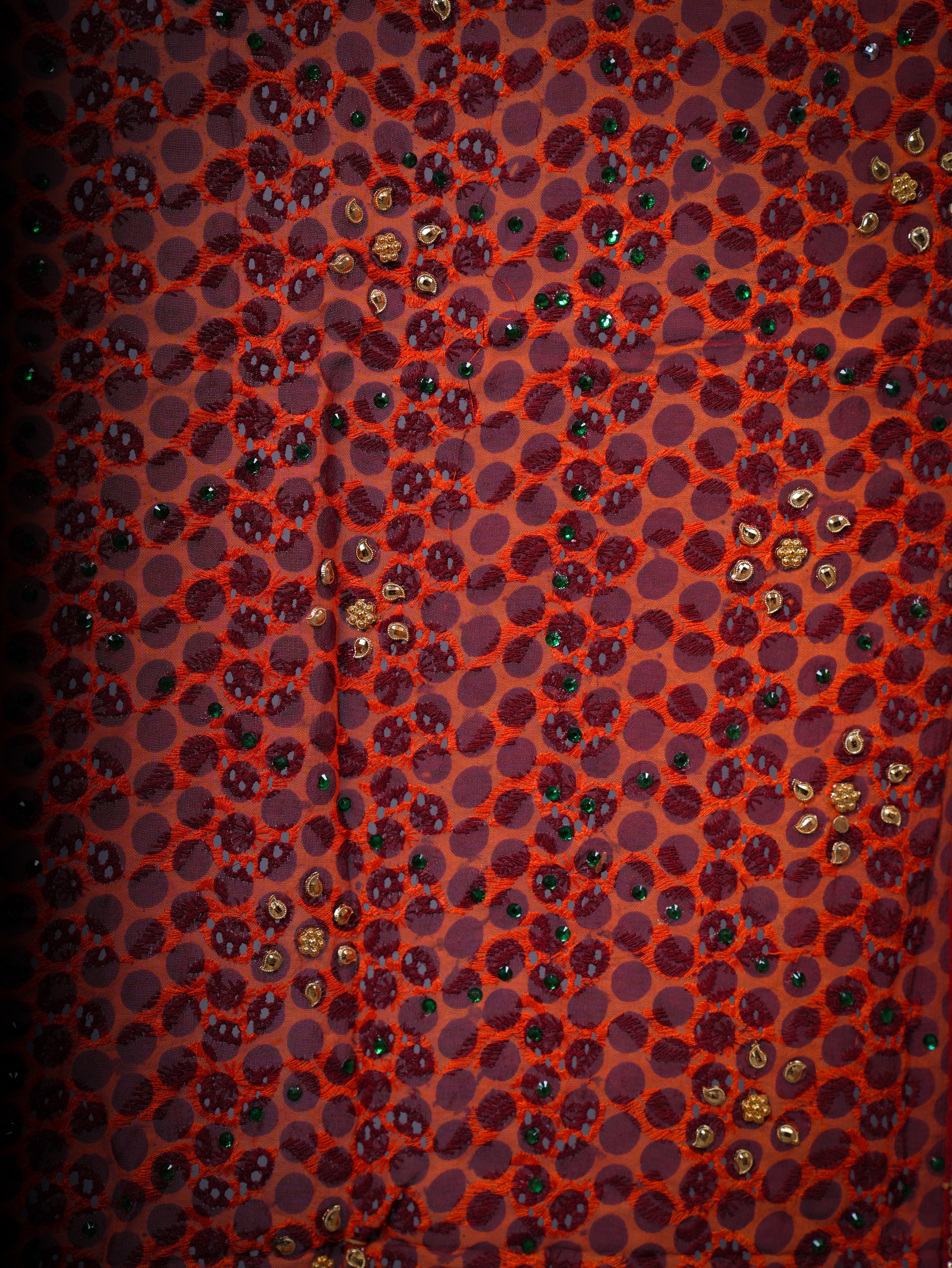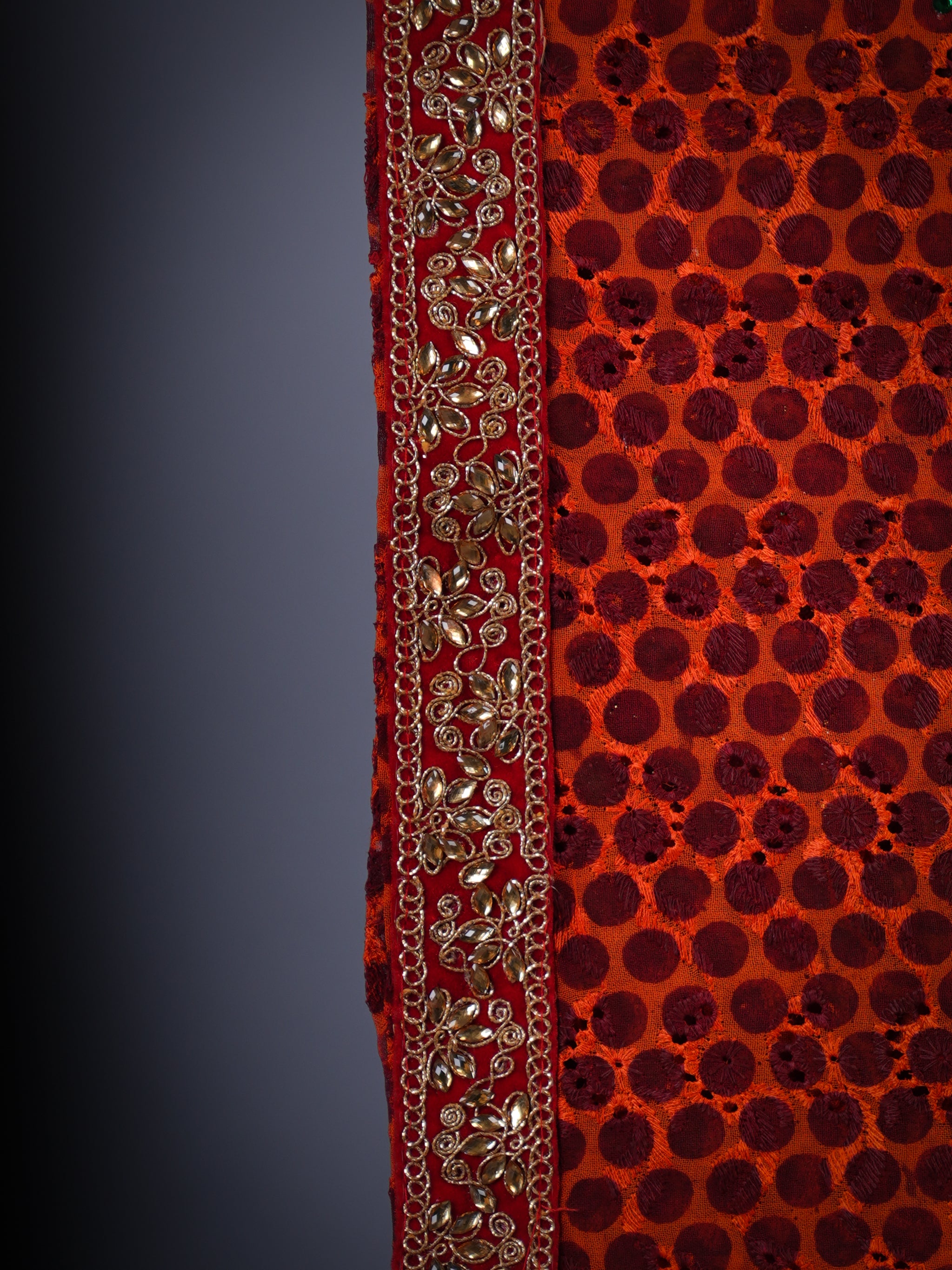 Elegant short chicken picchoda in soft georgette, beautifully finished with heavy handwork red lace. A perfect fusion of traditional artistry and contemporary grace—ideal for festive and special occasions