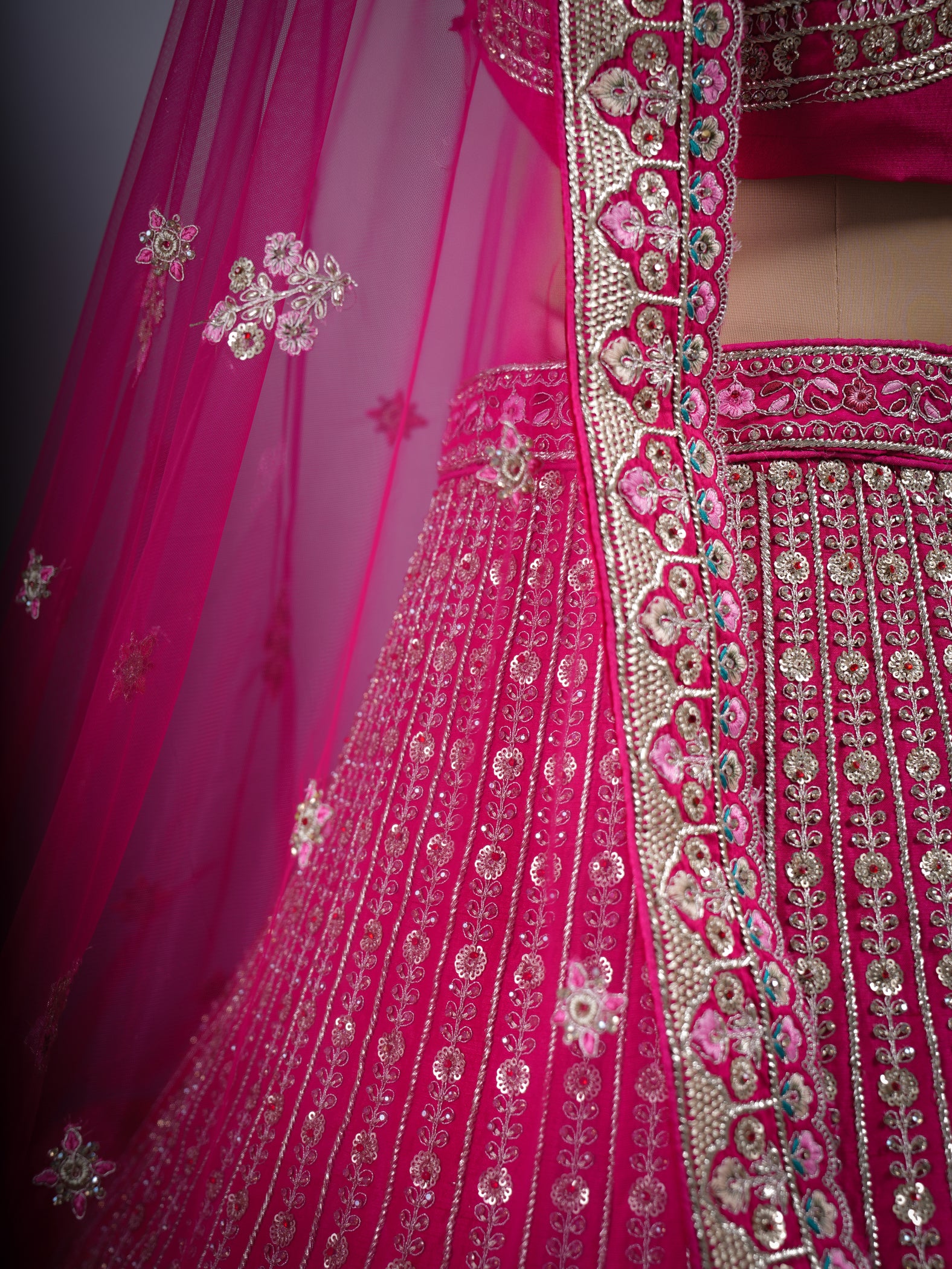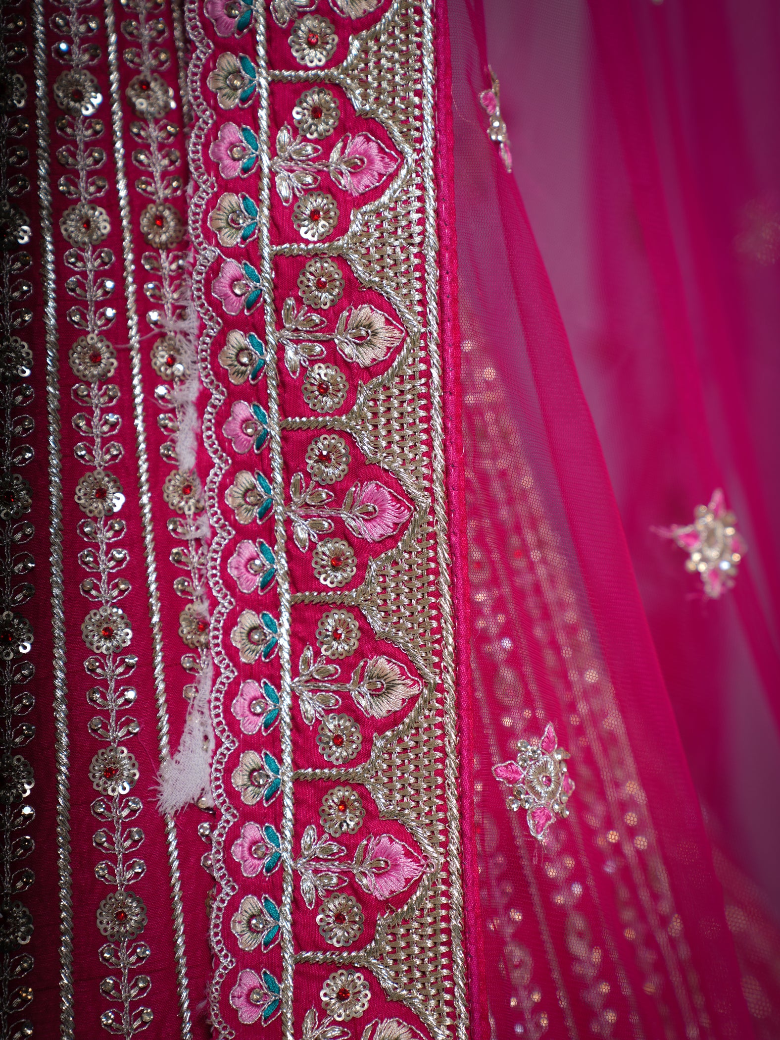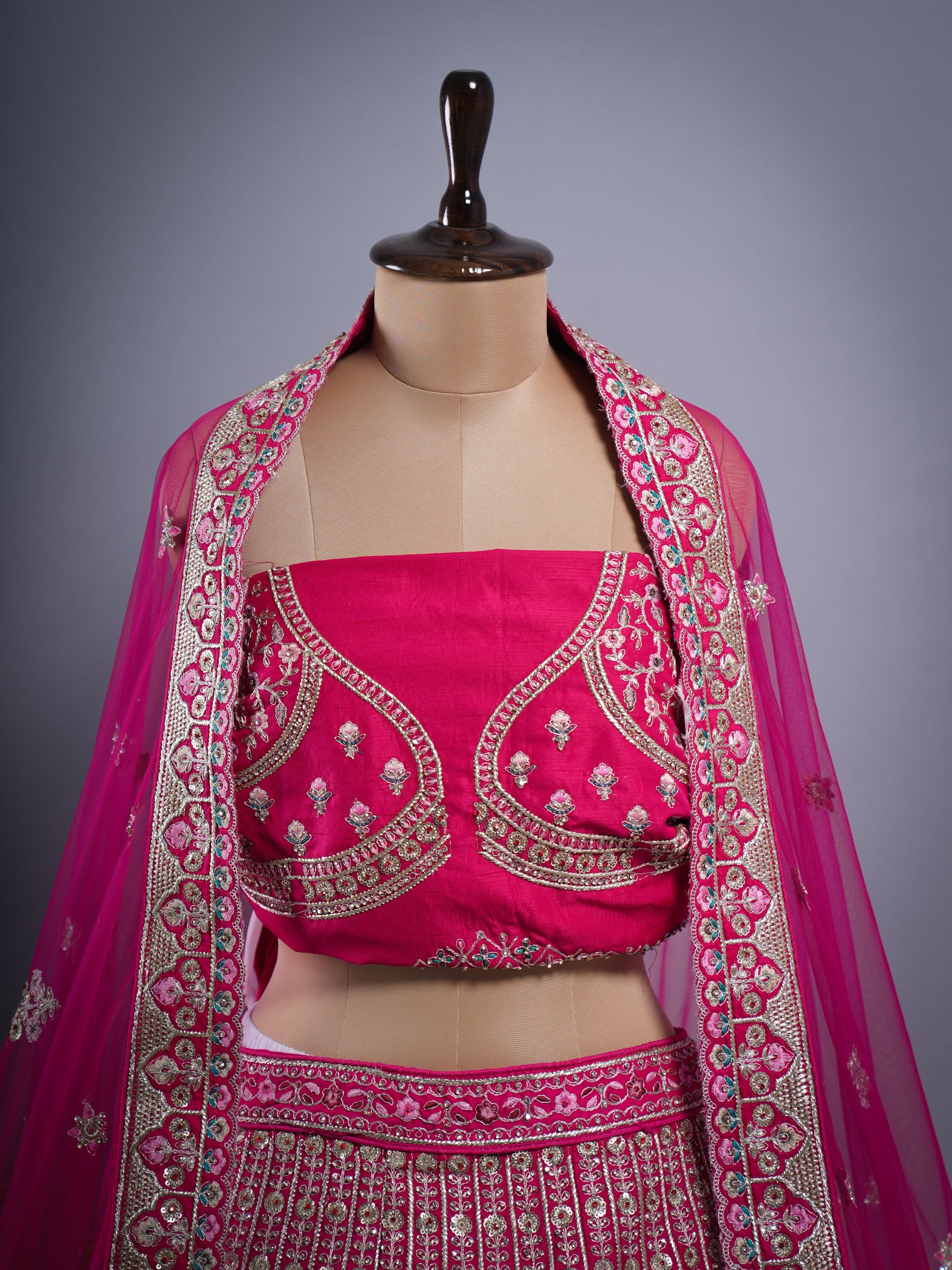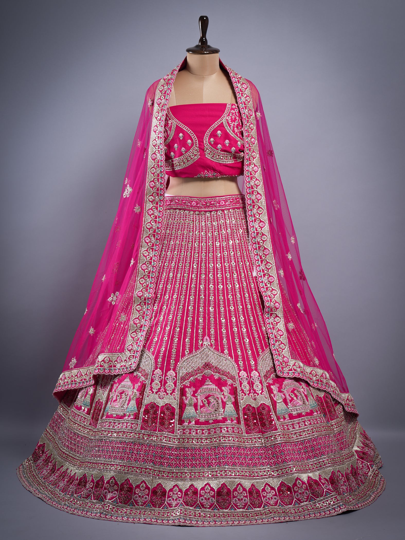 Stunning rani-colored silk fabric bridal lehenga, designed to make a statement on your special day. This ready-to-stitch lehenga combines luxurious fabric with exquisite craftsmanship, making it the perfect choice for an unforgettable bridal look.