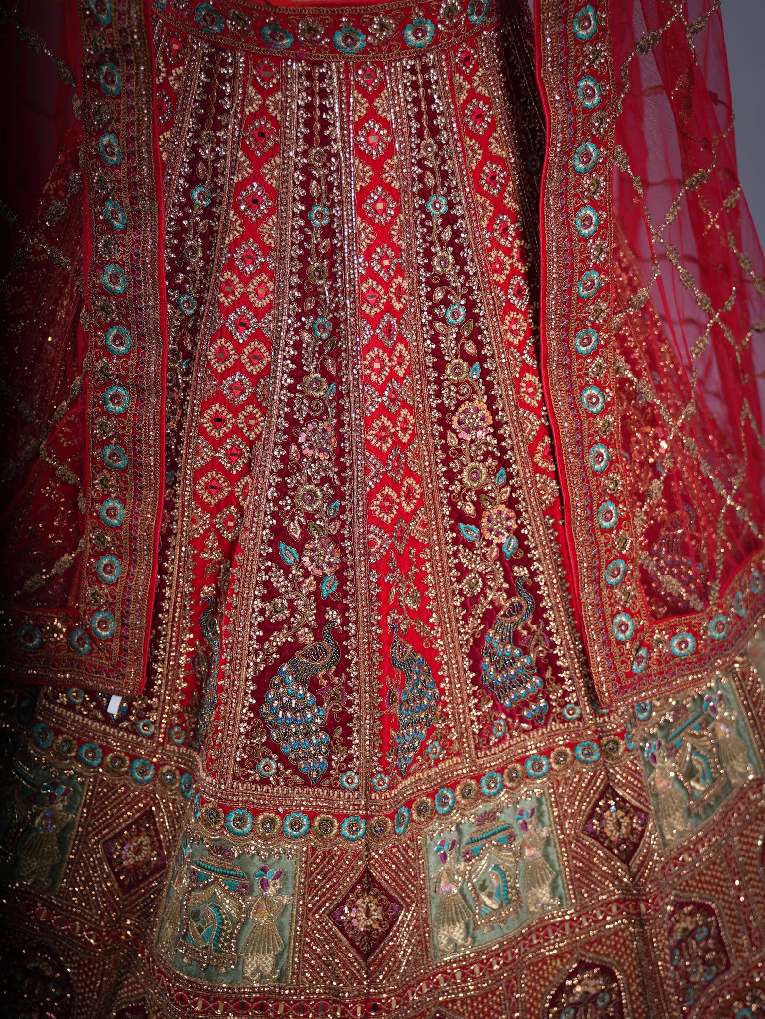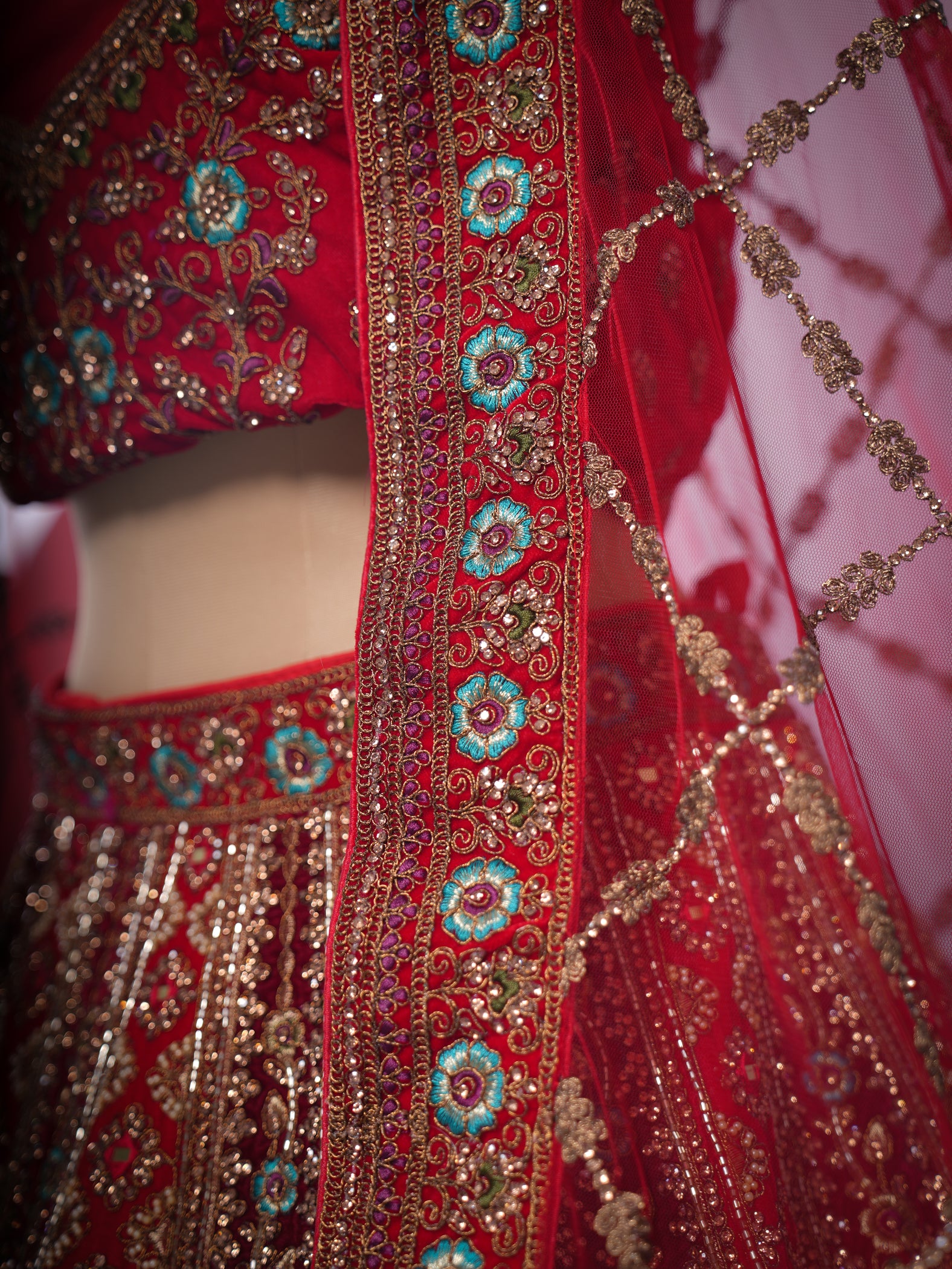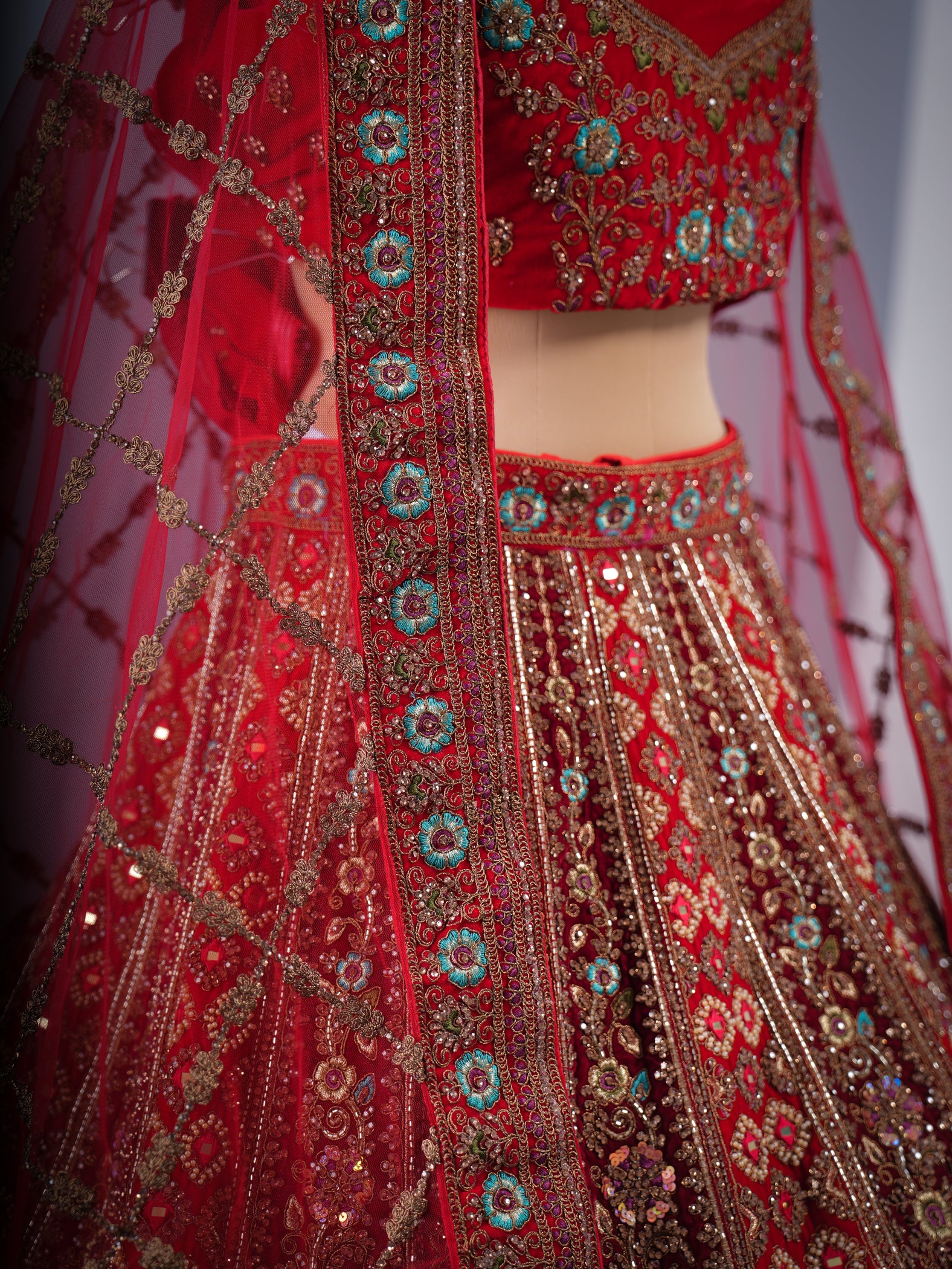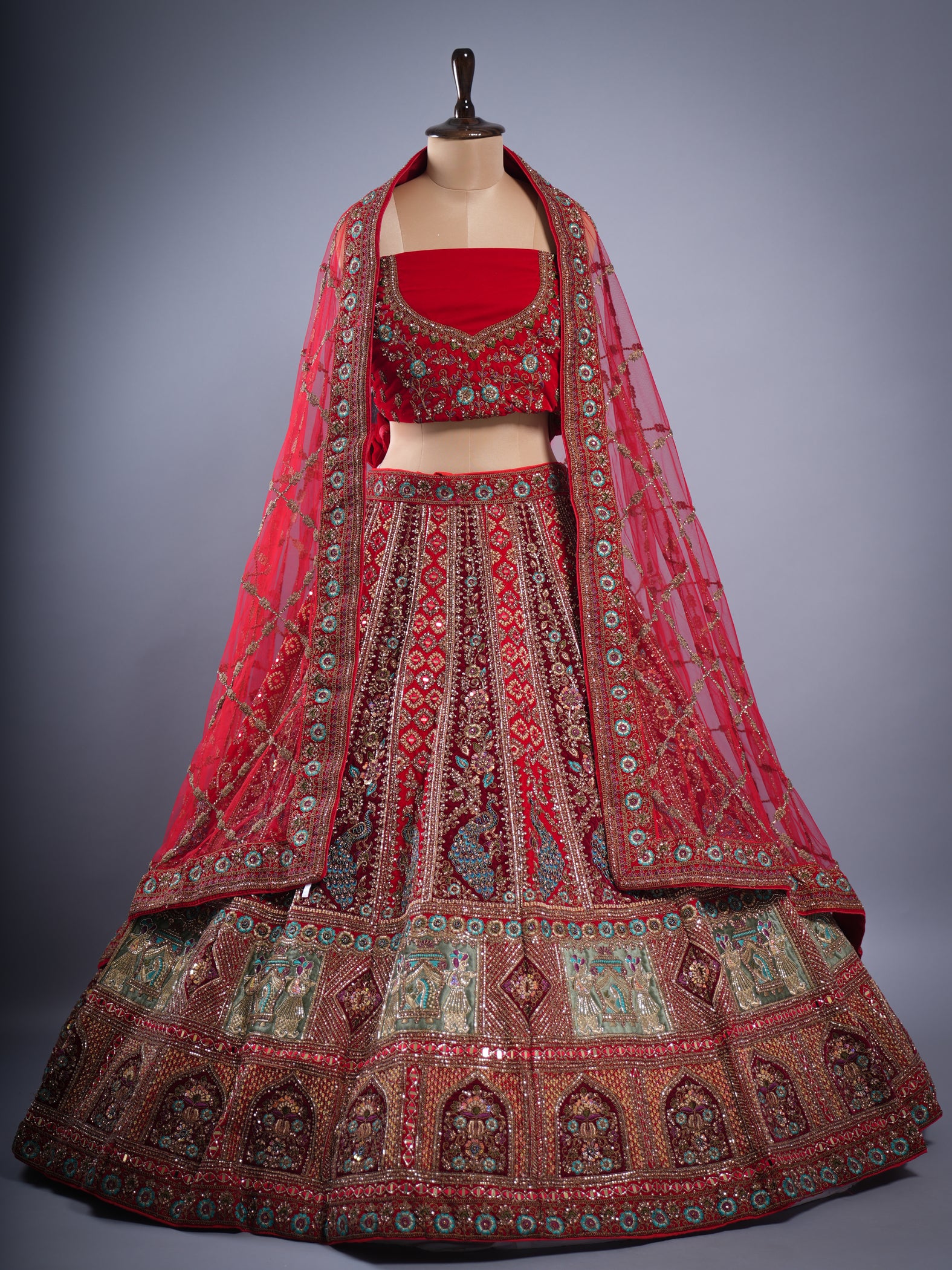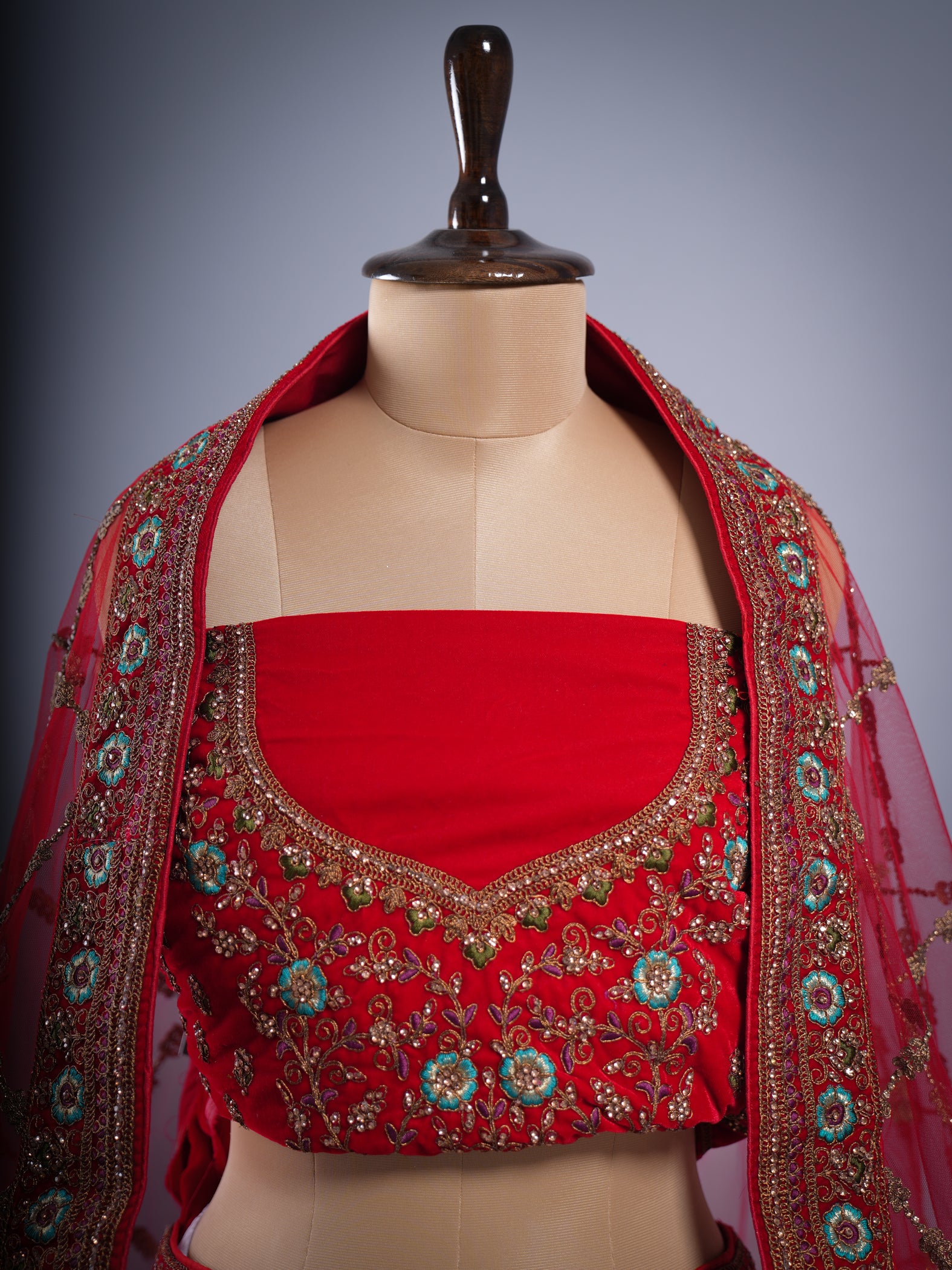 Opulent red-maroon velvet bridal lehenga, intricately adorned with heavy hand embroidery. This ready-to-stitch masterpiece exudes timeless elegance and rich craftsmanship, making it the perfect choice for a grand and unforgettable bridal look.
