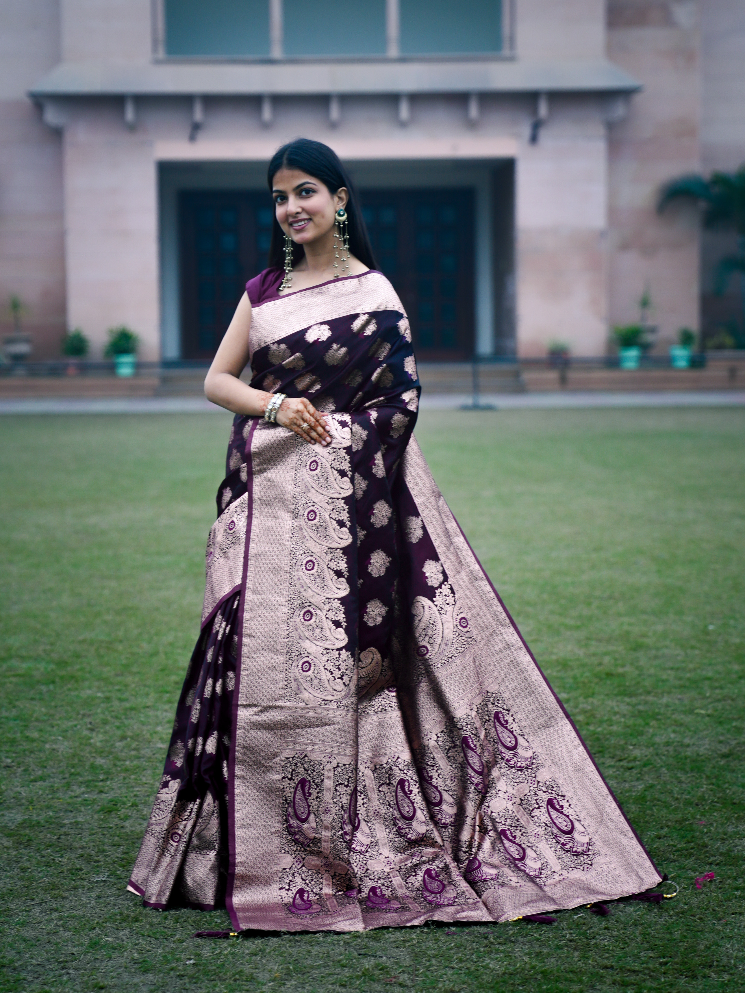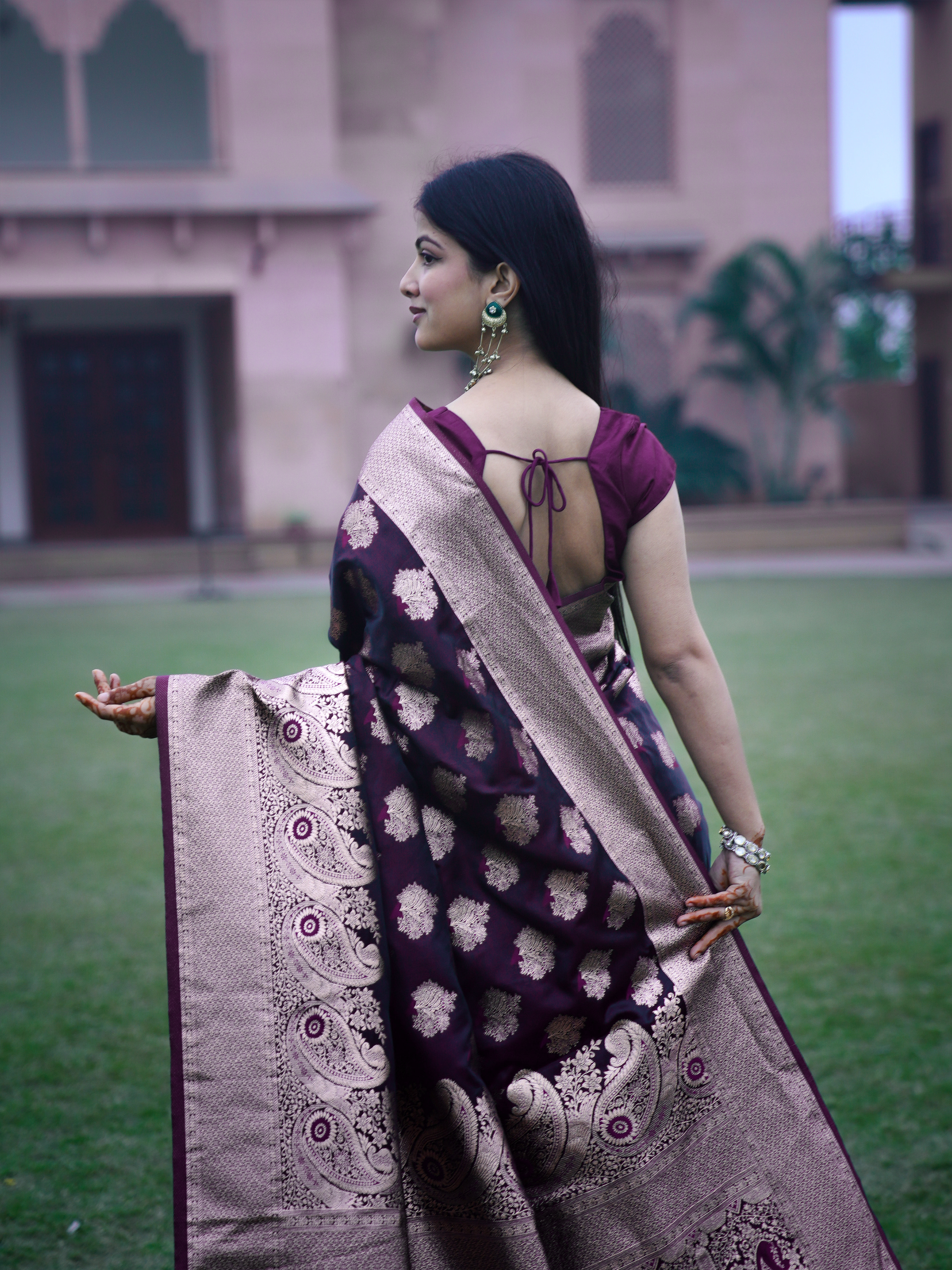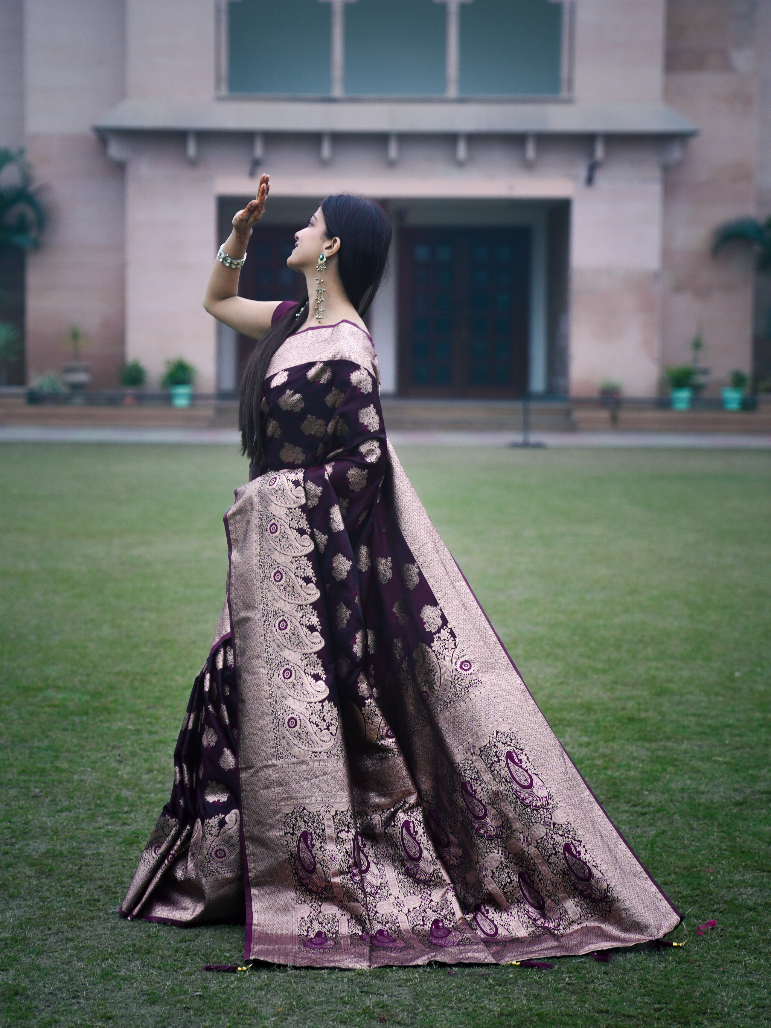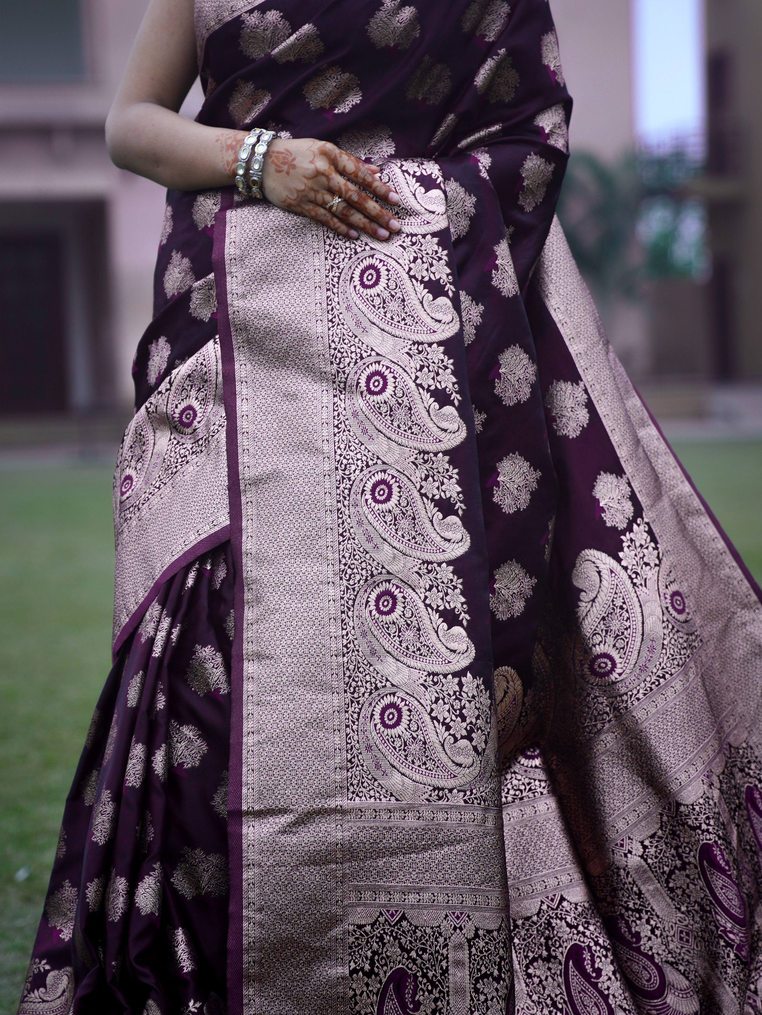 A rich satin silk saree in an elegant wine shade, featuring refined panel weaving for a graceful and timeless look.