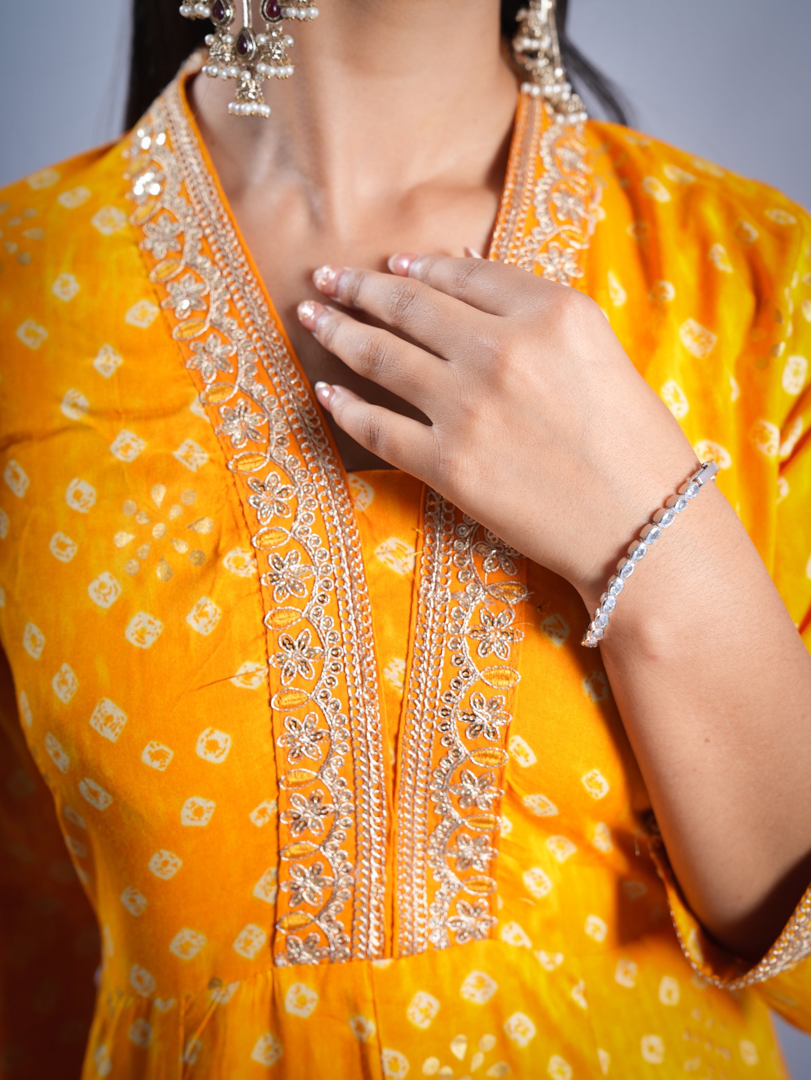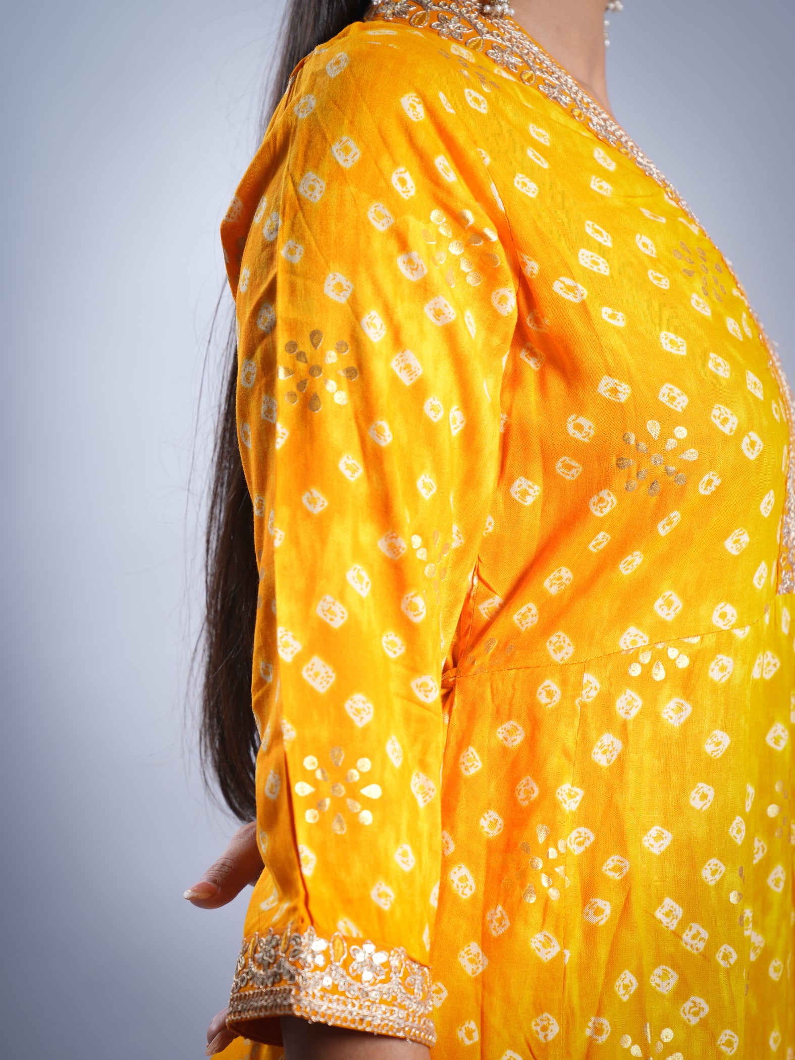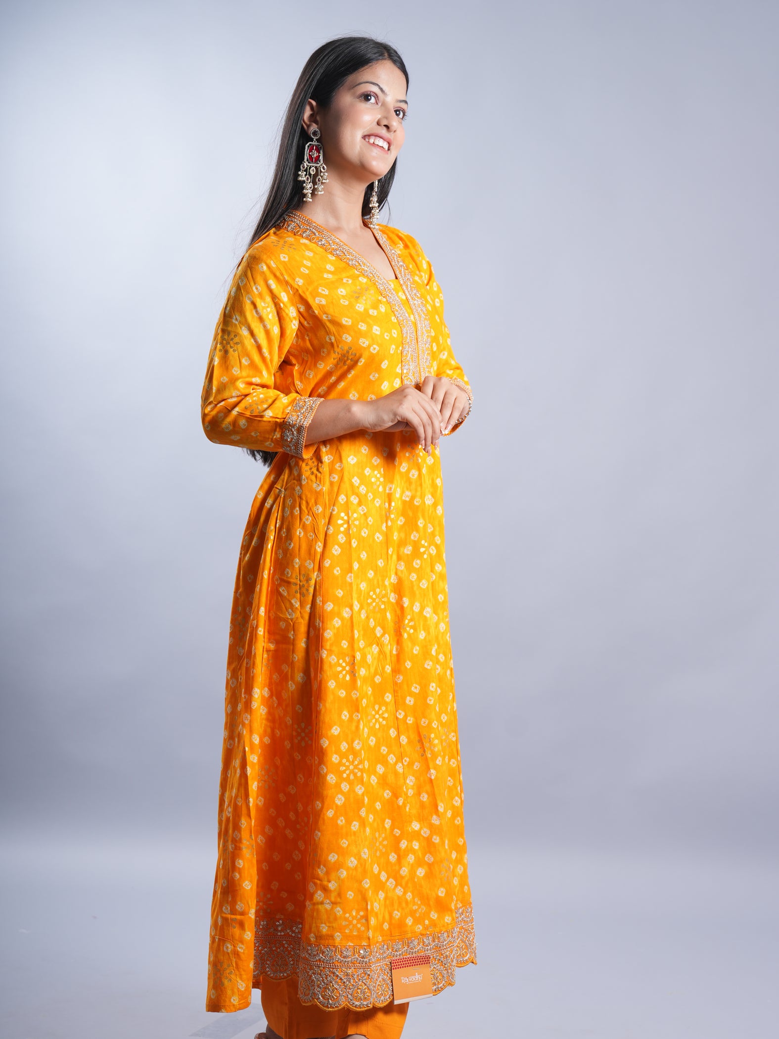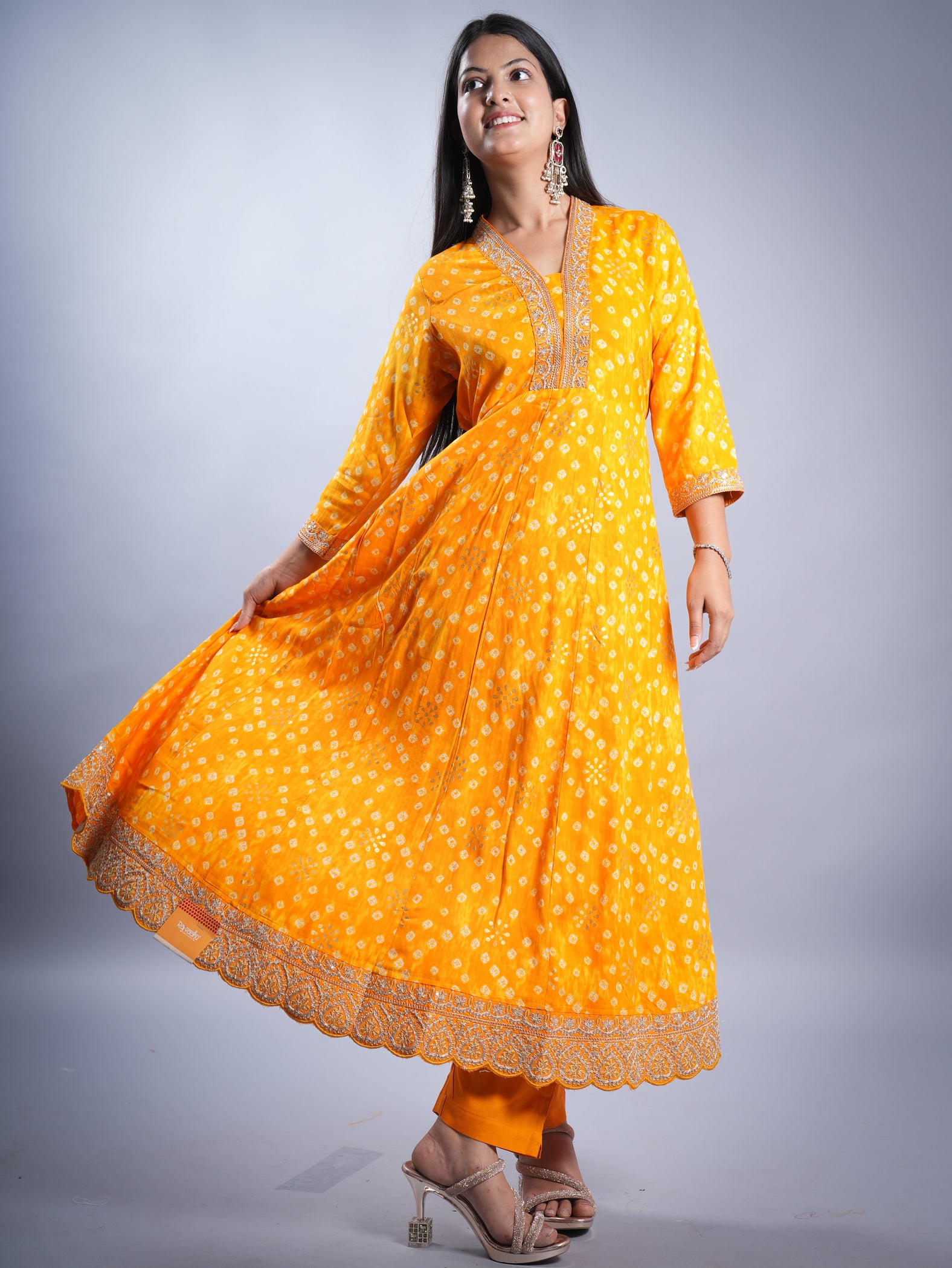 Radiate festive charm in this vibrant yellow Bandhej Anarkali set, crafted from soft rayon fabric with elegant foil print detailing. Featuring a flattering V-neckline, flowy silhouette, matching bottoms, and a coordinating dupatta, this 3-piece ensemble is perfect for celebrations, gatherings, and ethnic chic moments.
