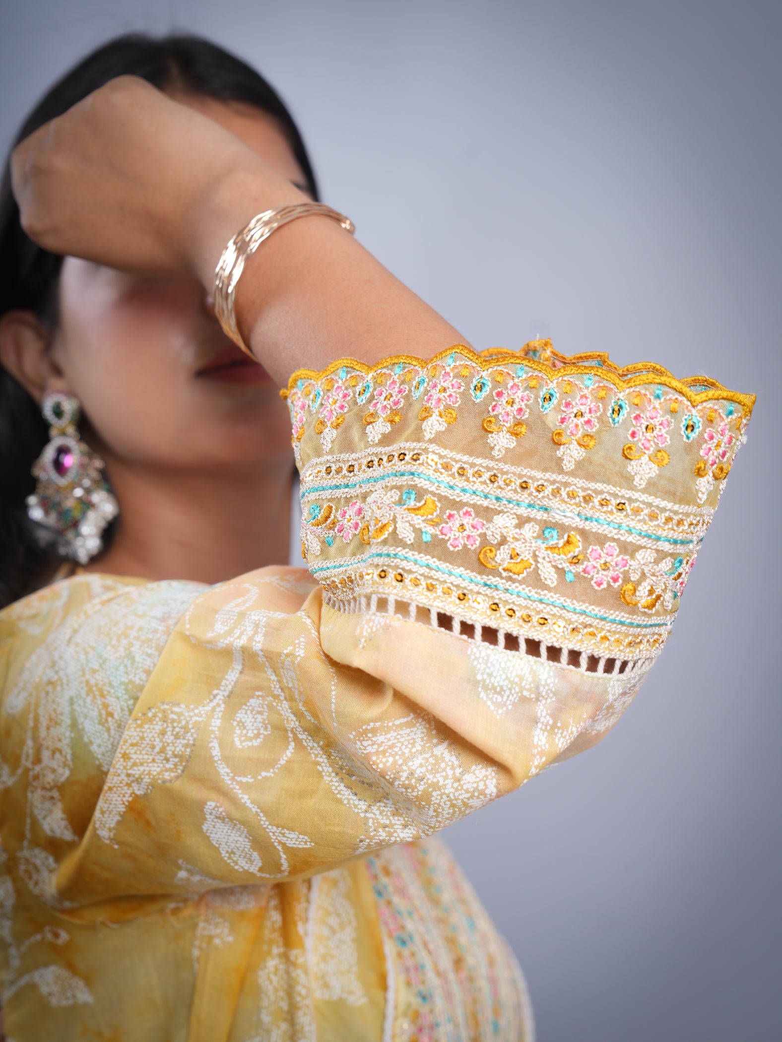Radiate vibrant energy in this yellow cotton Anarkali set, designed for your special Haldi ceremony or festive occasion. The flowy Anarkali kurta is complemented by matching bottoms and a coordinating dupatta, making this 3-piece set a perfect blend of tradition and comfort for celebrations.